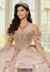 Make unforgettable memories on your special day wearing Princesa Quinceanera style PR70106. This charming ballgown showcases a strapless v neckline paired with optional off the shoulder straps. This dress is completely decked out in unique lace applique and illuminating sequins, revealing a detachable back bow and capelet will be sure to have all eyes on you.