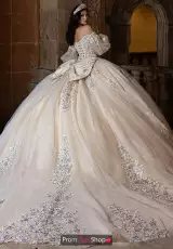 Make a grand entrance on your special day wearing this stunning ballgown by Rachel Allan Quince, style RQ1165. Featuring a romantic scoop neckline paired with detachable sleeves for that two in one look. The accentuating corset with a detachable bodice liner is adorned in applique and beadwork cascading down the glitter tulle skirt. The detachable bow is the perfect finishing touch, this dress truly gives you the best of both worlds.