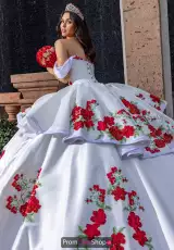 Create timeless memories in this breathtaking ball gown by Rachel Allan Quince, style RQ5016. Showcasing a detachable off the shoulder v neckline that will leave everyone in awe. This one of a kind dress features a detachable corset overlay to create a change in looks throughout your special night paired with a satin detachable jacket. The bodice is embellished with a luxurious combination of beadwork glitter, applique and sequins that cascade into the long glitter tulle train overlayed by two satin layers on the voluminous skirt.